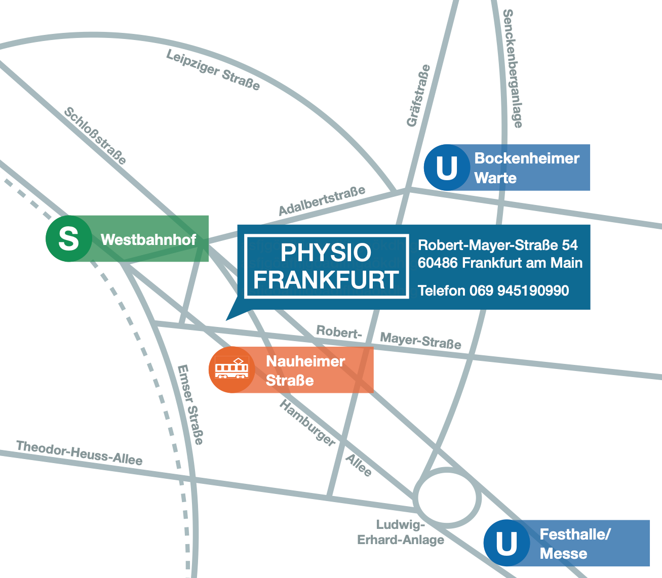 Die nächstgelegene Haltestelle heißt „Nauheimer Straße“, erreichbar mit der Straßenbahnlinie 17. Mit der U-Bahn können Sie Linie U4 bis Festhalle/Messe nutzen und dort in die Straßenbahn umsteigen. Wenn Sie bis zur Bockenheimer Warte (U4, U6, U7) fahren, gehen Sie stadtauswärts auf die Adalbertstraße, biegen nach 350 m links in die Homburger Straße ab, passieren nach rund 300 m die Fußgängerampel der Schloßstraße und gehen nach rechts in die Robert-Mayer-Straße. Nach weiteren 100 m erreichen Sie Hausnummer 54 auf der rechten Seite. Mit der S-Bahn nutzen Sie bitte den Halt „Westbahnhof“, von dort sind es noch rund 450 m über die Kasseler Straße sowie die Hamburger Allee bis zu uns.